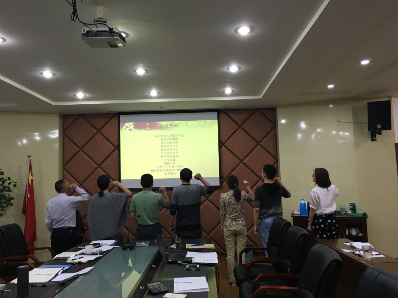 最后由新一屆宣傳委員趙楠同志帶領全體黨員面向黨徽進行宣誓,一方面對照誓詞重溫最初的志愿,另一方面在思想和行動上也給我支部的入黨積極分子起到了積極的示范和帶動作用。