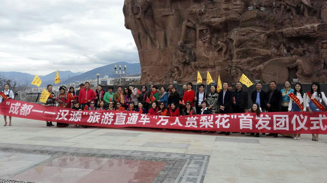 3月10日在成都新南門(mén)旅游集散中心和漢源揚(yáng)帆起航廣場(chǎng)舉行了“成都—漢源”直通車(chē)“萬(wàn)人賞梨花”首發(fā)團(tuán)儀式。漢源縣副縣長(zhǎng)龔榮高、縣旅游局局長(zhǎng)李毅、成都旅游集散中心旅游營(yíng)運(yùn)部主任許蜀錦、成都天府旅行社和雅安文旅公司相關(guān)負(fù)責(zé)人出席了首發(fā)團(tuán)儀式。