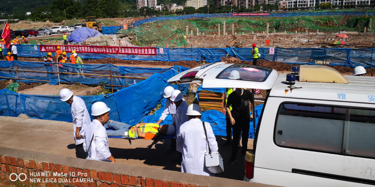 本次演練分為疏散保衛(wèi)組、醫(yī)療救治組、物資保障組、應(yīng)急救援組和信息發(fā)布組五個防洪防汛應(yīng)急演練組?,F(xiàn)場模擬演練周公堰河水因連續(xù)暴雨導(dǎo)致河水上漲,漫過堰堤,雅安熊貓會展博覽館基坑作業(yè)面大量進水,項目安全負責(zé)人確認(rèn)險情后,立即啟動防汛應(yīng)急預(yù)案。