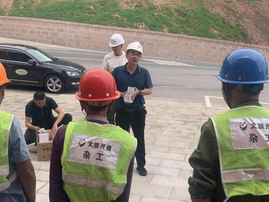 在熊貓高地和皇茶項(xiàng)目,王躍分別向戶外高溫作業(yè)下的現(xiàn)場(chǎng)施工人員及管理人員派發(fā)藿香正氣液、礦泉水等防暑降溫物資,把清涼送到了生產(chǎn)一線,把關(guān)懷送到了員工心坎。他首先感謝大家克服高溫炎熱、盡職盡責(zé)的工作,并叮囑大家在保證安全生產(chǎn)的同時(shí),一定要注意做好防暑降溫工作,避免中暑,將自己身體健康放在首位,為公司發(fā)展再建新功。