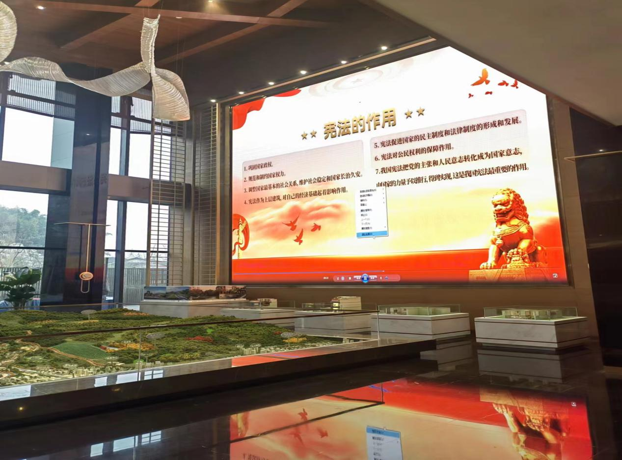 三是定點(diǎn)投放憲法宣傳標(biāo)語。為加強(qiáng)憲法宣傳,提高公民的法律意識,同時(shí)起到時(shí)刻提醒公民關(guān)注憲法、了解憲法的作用,雅安文旅集團(tuán)通過酒店大屏、建設(shè)工地、房產(chǎn)銷售中心等多處電子宣傳屏投放憲法宣傳標(biāo)語,以此營造良好的憲法宣傳氛圍,增強(qiáng)了憲法學(xué)習(xí)宣傳聲勢,形成了規(guī)模效應(yīng)。