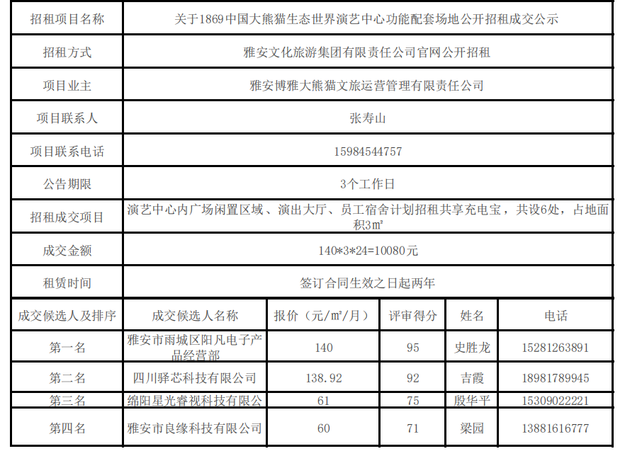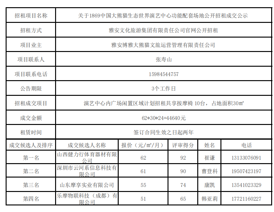 關(guān)于1869中國大熊貓生態(tài)世界演藝中心功能配套場地公開招租成交公示