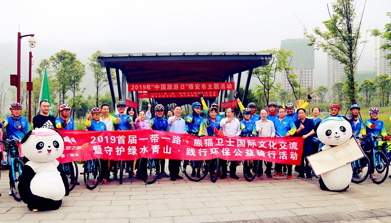 5月18日,“2019中國·雅安首屆一帶一路、熊貓之旅國際文化交流暨守護(hù)綠水青山、踐行環(huán)保公益騎行”活動出征儀式在雅安市熊貓綠島舉行。雅安市人大副主任李勇宣布出發(fā),24名騎手從318川藏南線起點雅安出發(fā),前往拉薩,隨后轉(zhuǎn)向中法、中非兩條騎行線路,以此壯舉禮敬新中國成立70周年和大熊貓科學(xué)發(fā)現(xiàn)150周年。雅安文旅集團(tuán)向騎行隊贈送“團(tuán)圓熊貓茶”,為艱苦的行程送上健康的保障,并向世界發(fā)出雅安的問候。